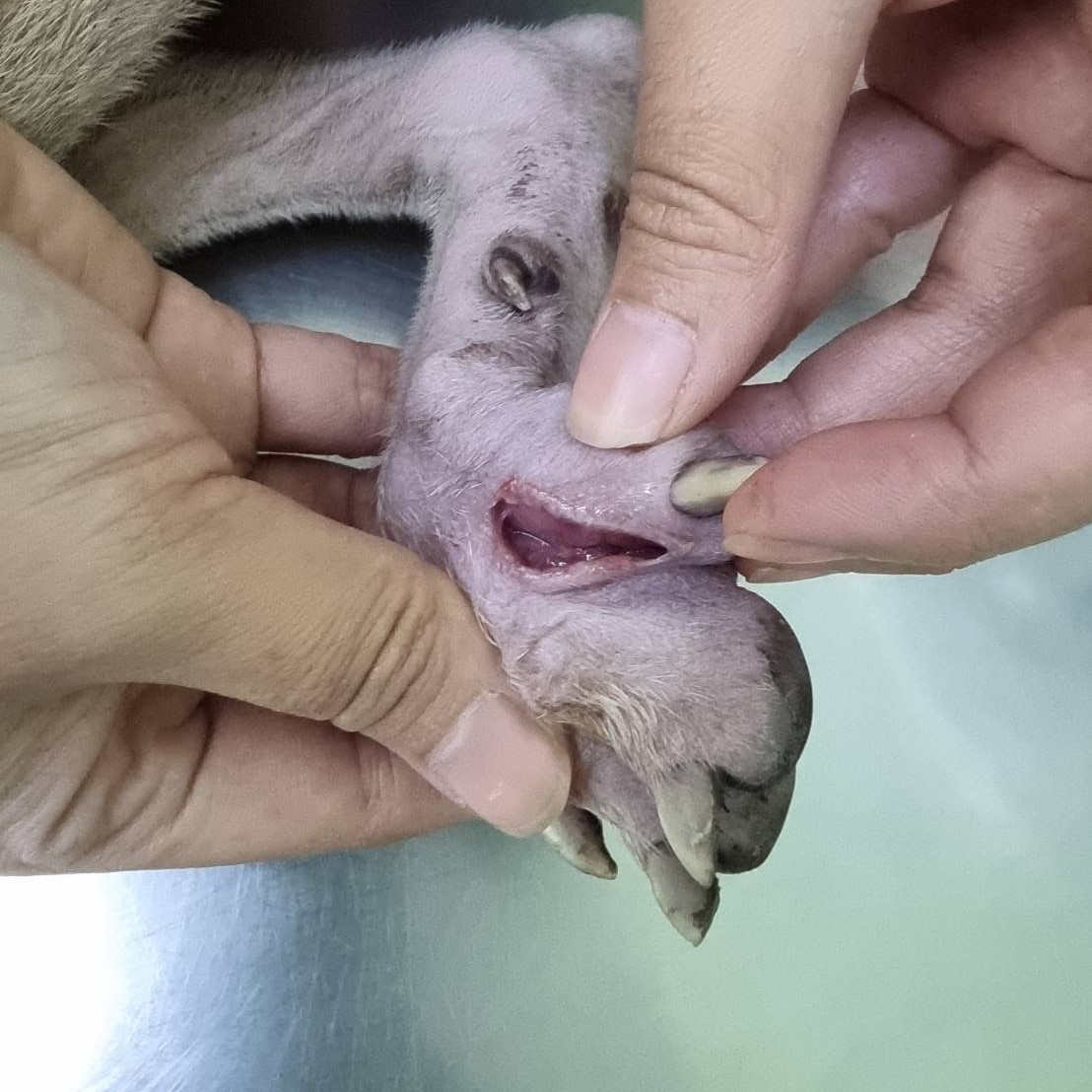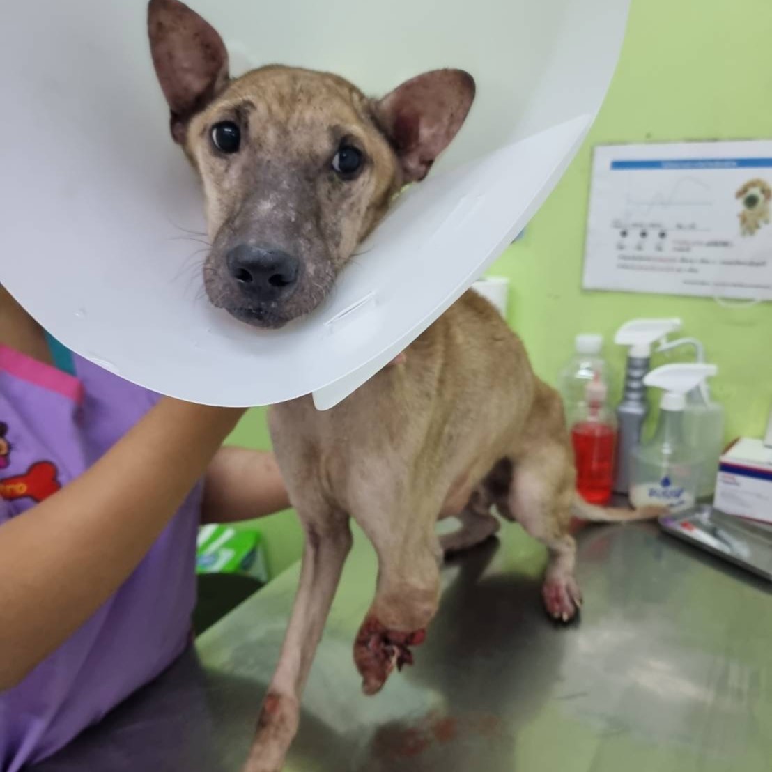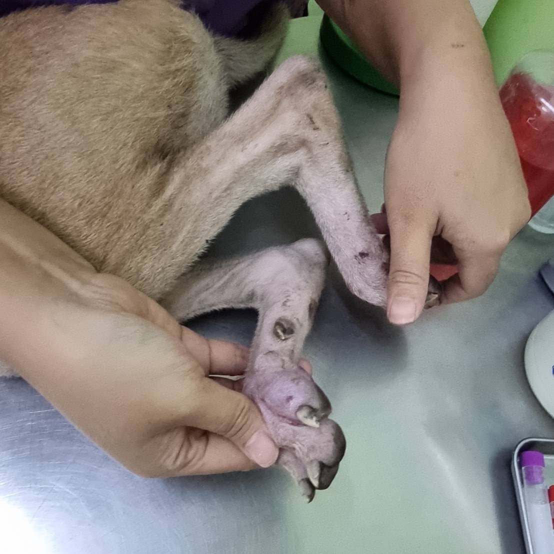 อาการ/โรค: พบขามีรอยจากของมีคม ตรวจพบรอยกรีด ที่ขาหน้าข้างซ้าย คุณหมอต้องตัดขาทิ้ง ทำให้ต้องพิการ มี 3 ขา